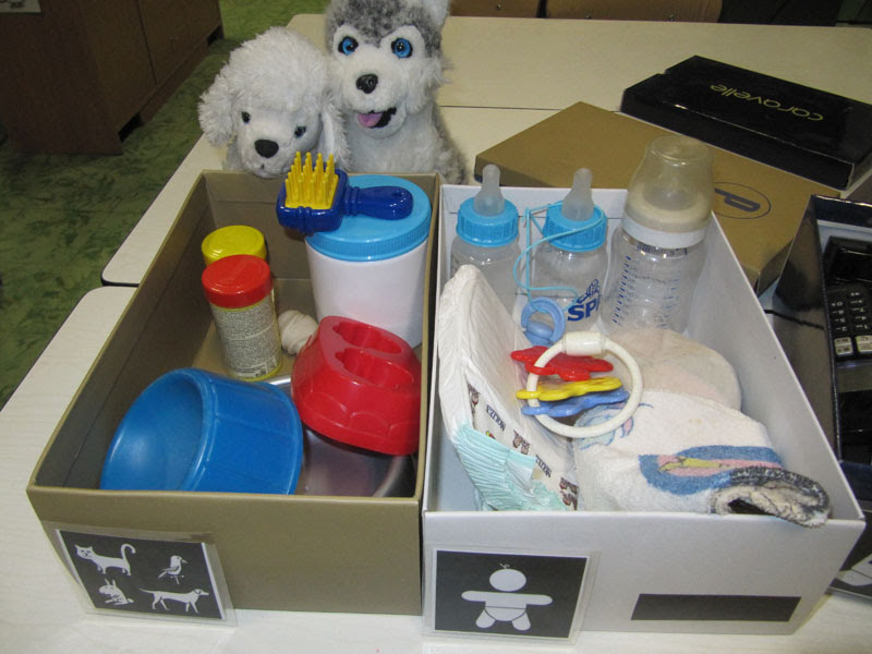 Laaiend enthousiast door het volgen van twee bijscholingen van Cego (Centrum Ervarings Gericht Onderwijs) ‘Binnenklasdifferentiatie’ door Marieke Holvoet en ‘Werken zonder thema’ door Els Menu, startte ik in mijn klas met themadozen. Na observatie van het spel in de huishoek/poppenhoek besloot ik om met 4 dozen te beginnen: een dieren-, een baby-, een schoonmaak- en een gsm- / fototoestel-doos. Heel wat materiaal voor deze dozen haalde ik uit de poppenhoek (waardoor deze wat soberder werd), aangevuld met leuke extra’s.