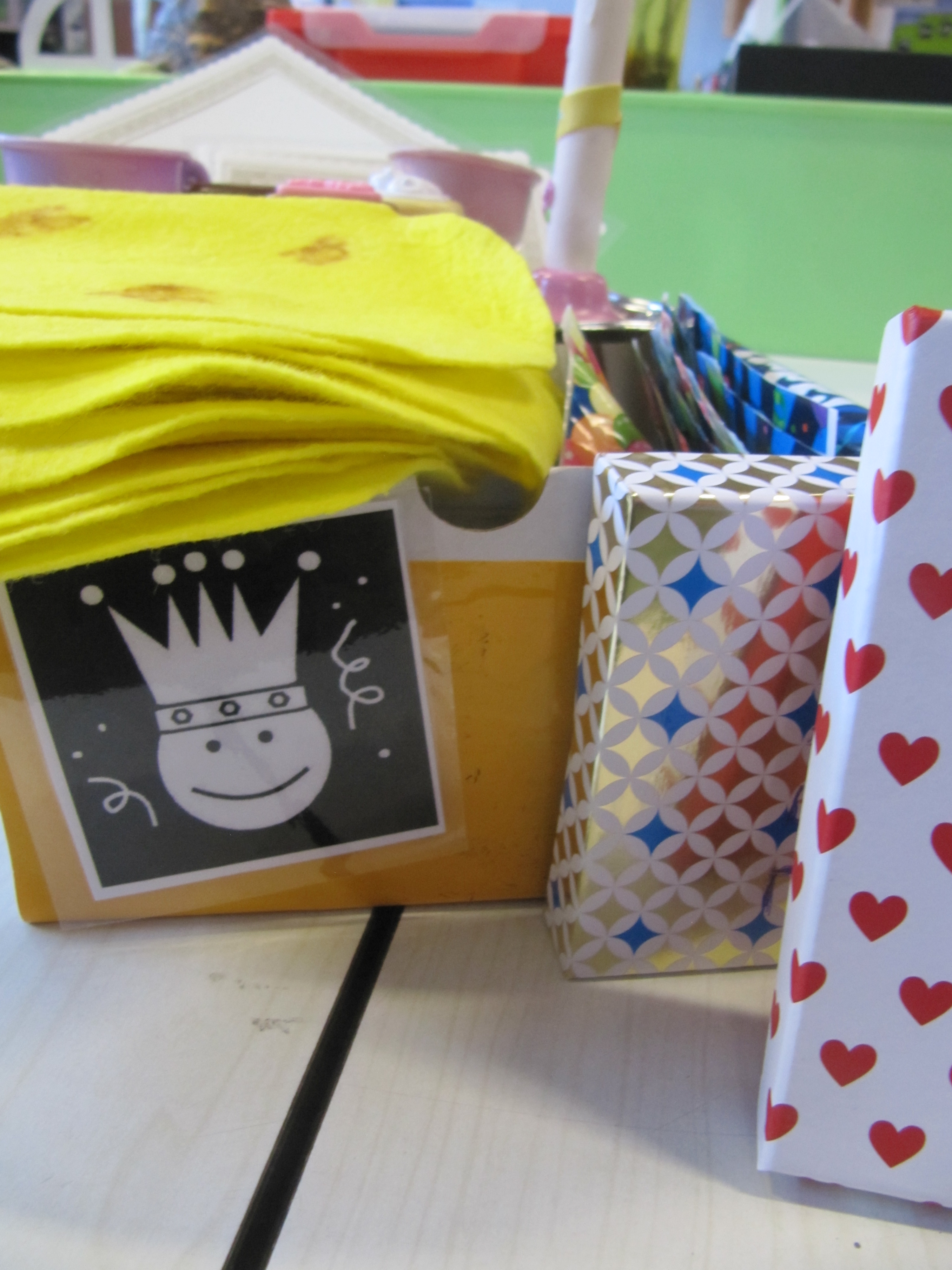 Later kwam er een verjaardagsdoos bij met vlagjes (met houten spelden erbij), pannenkoeken gemaakt van gele dweilen (naar een ideetje van Griet Leye), servetjes, extra mooi servies, ‘kanten’ taarten-onderleggers, ‘gebakjes’, plastieken kaarsjes en cijfertjes, …