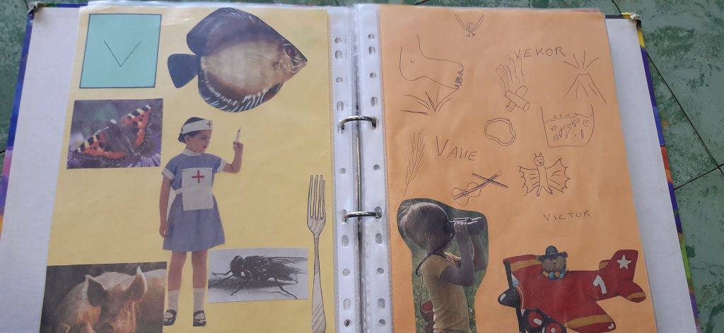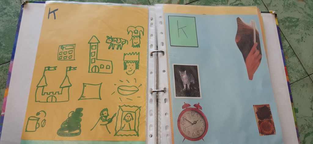 Het is de bedoeling dat de kleuters (uit te knippen) afbeeldingen van voorwerpen die beginnen met die specifieke letter, verzamelen en meebrengen naar school. Tijdens een kringmoment tekent de juf er ook voorwerpen bij die de kinderen spontaan opnoemen. Zo wordt het ‘hun’ lettermap want zij zullen perfect kunnen benoemen wat jij met een bepaald, niet zo fraai getekend 🙂 voorwerp bedoelt.