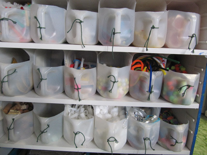 Spaar alvast de plastiek flessen waarin gedestilleerd water wordt verkocht! Ze kunnen namelijk een heel handig opbergsysteem worden. Super toegankelijk voor de kinderen want er is zelfs een handvat voorzien waardoor rondstappen en naar een werkplaats gaan, zelden zorgen voor ‘verlies van lading’.