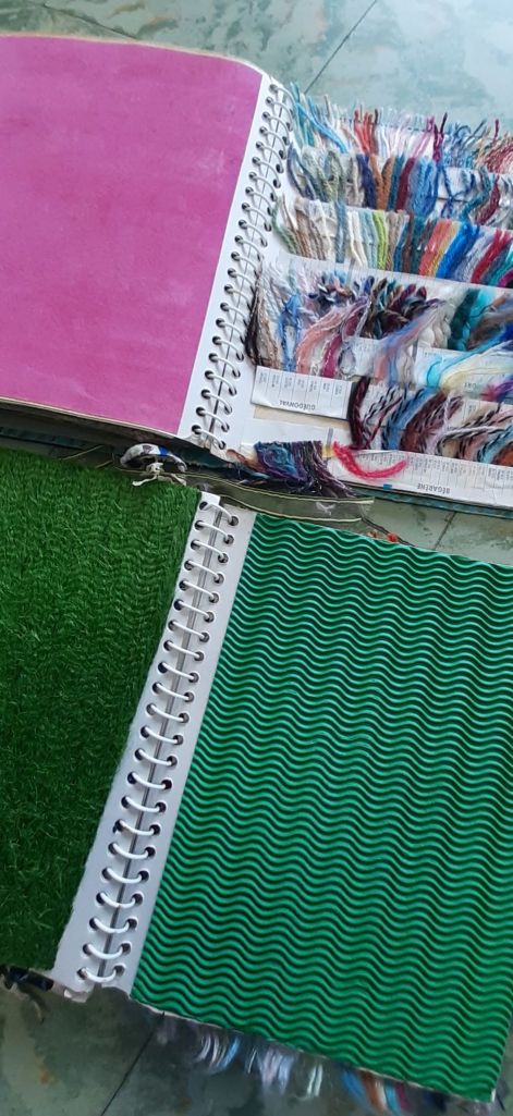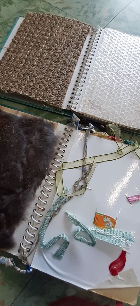De basis is een fotoboek met zelfklevende harde pagina’s waarvan je de folie verwijdert en vervangt door platte voelvlakken. Als je alles goed vast kleeft, is dit zeker geschikt voor peuters en eerste kleuterklassers.
