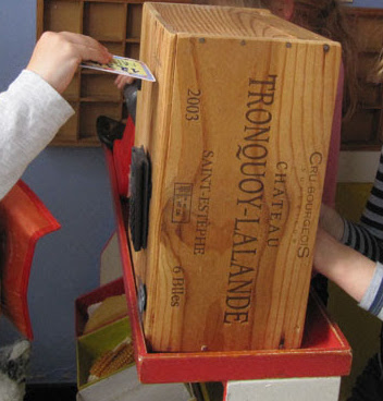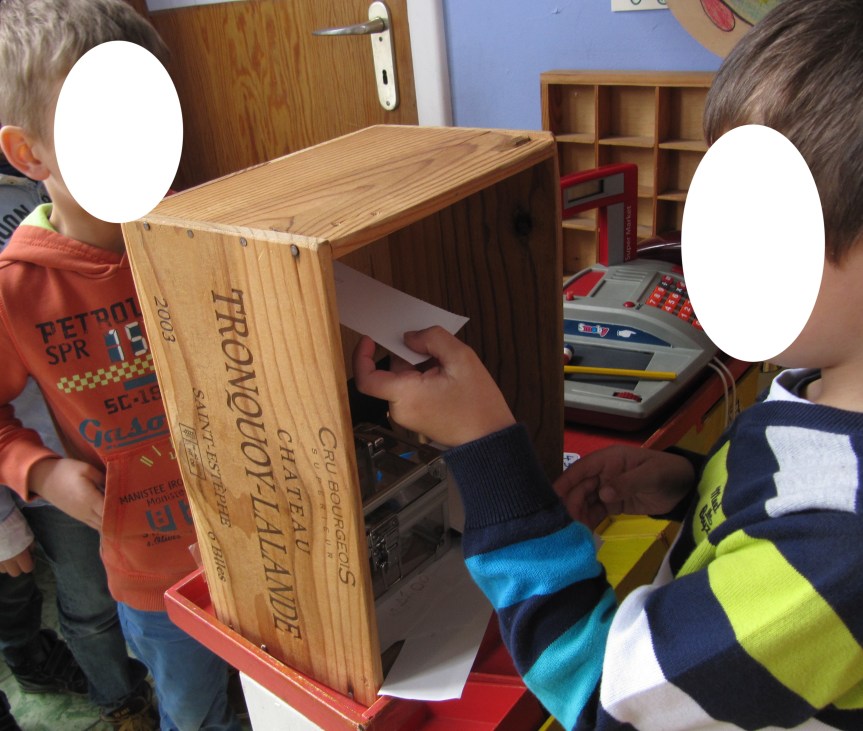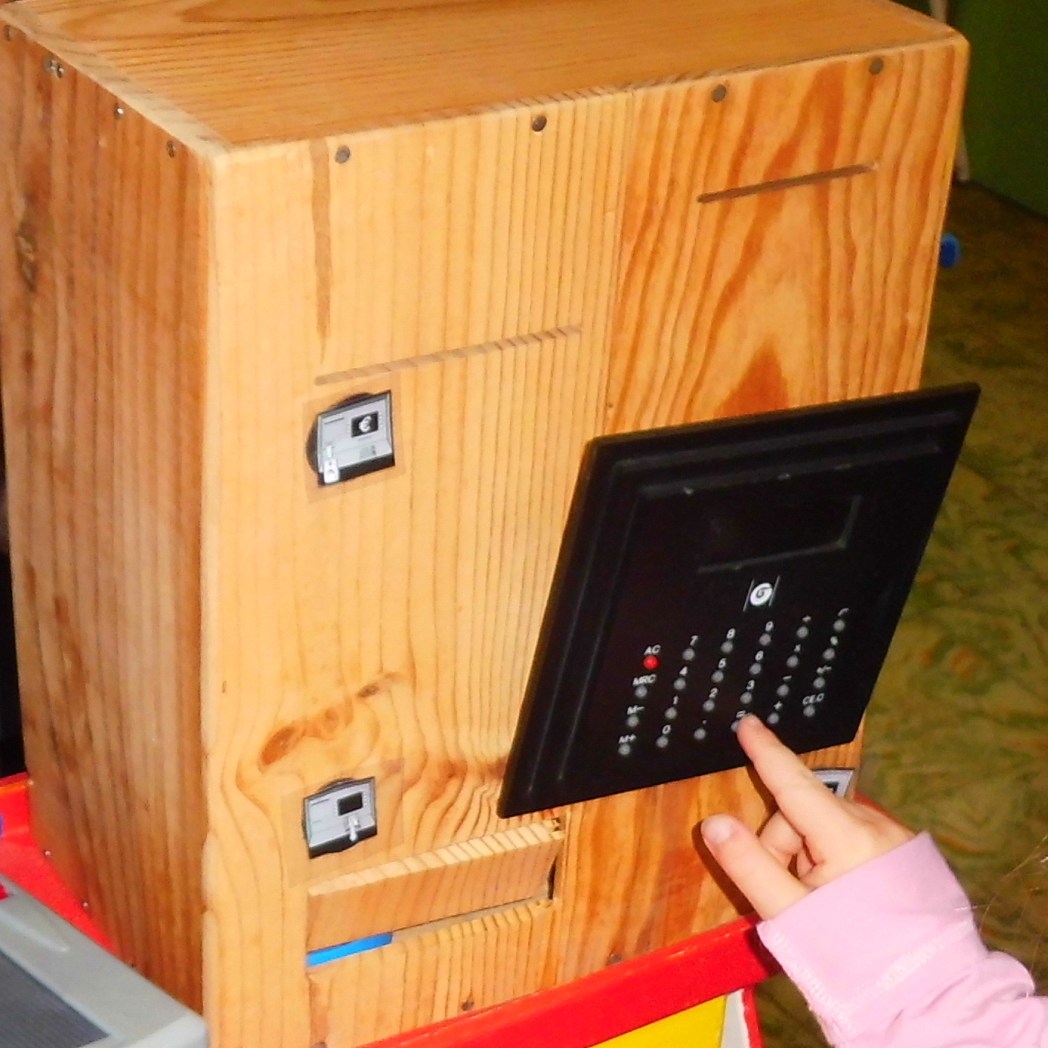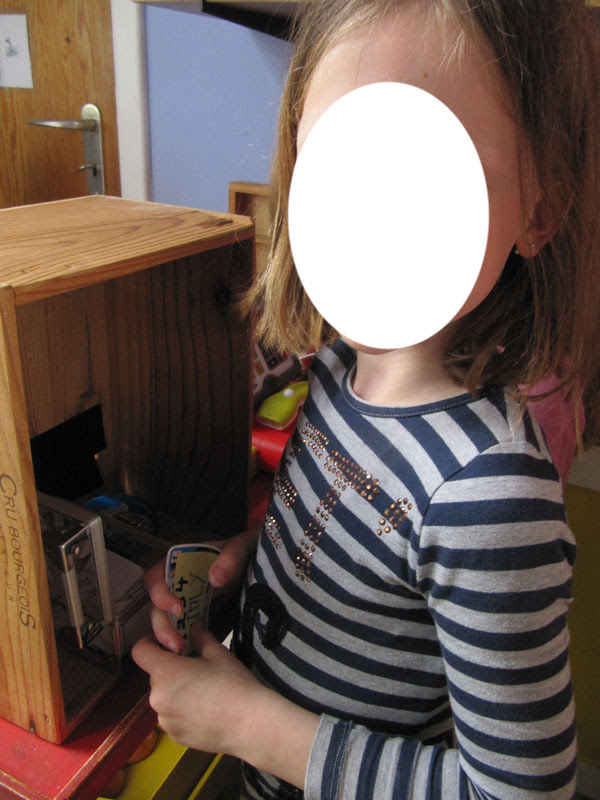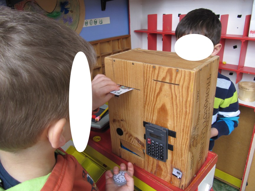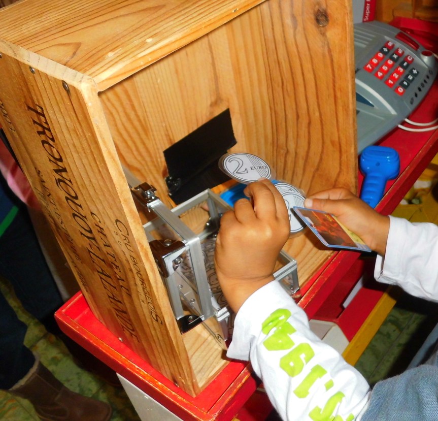 En nu zijn we er, naast het aanbieden van inzichten in de ‘financiële wereld’ 🙂 is de komst van een heuse bankcontact de redding van ons klassikaal bankroet! De juf brengt een bankcontact mee. Die is gemaakt van een wijnkratje met een rekenmachine eraan, een luikje waar het geld kan worden uitgenomen en gleufjes voor de bankkaart en het transactie-overzichtje.