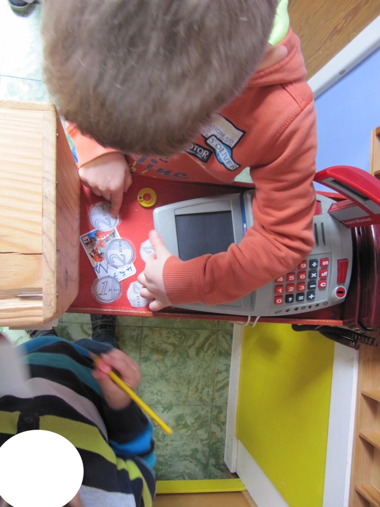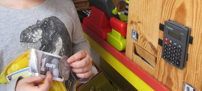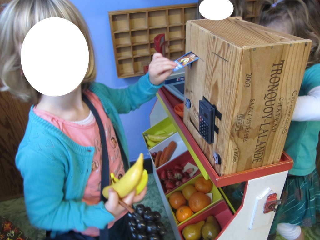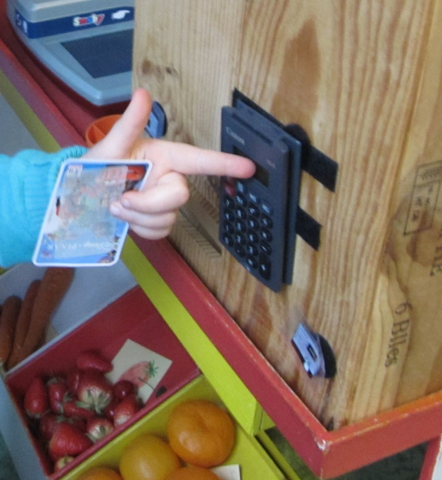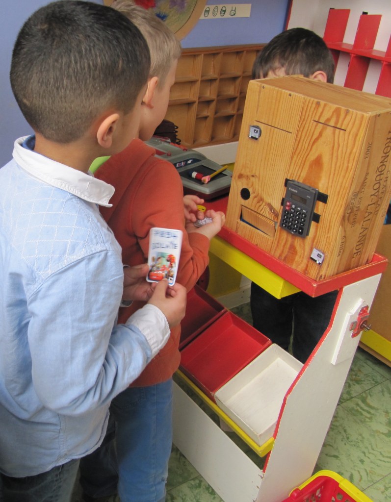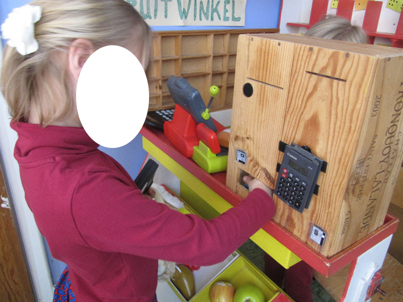De kinderen zoeken de gewenste koopwaren uit en halen in de winkel aan de bankcontact het gepaste geld af. Ze betalen onmiddellijk zodat het geld de winkel niet verlaat! Een goede oplossing voor het speelgeld dat anders overal terecht zou komen.