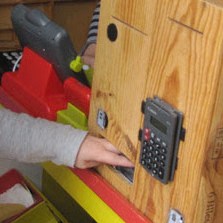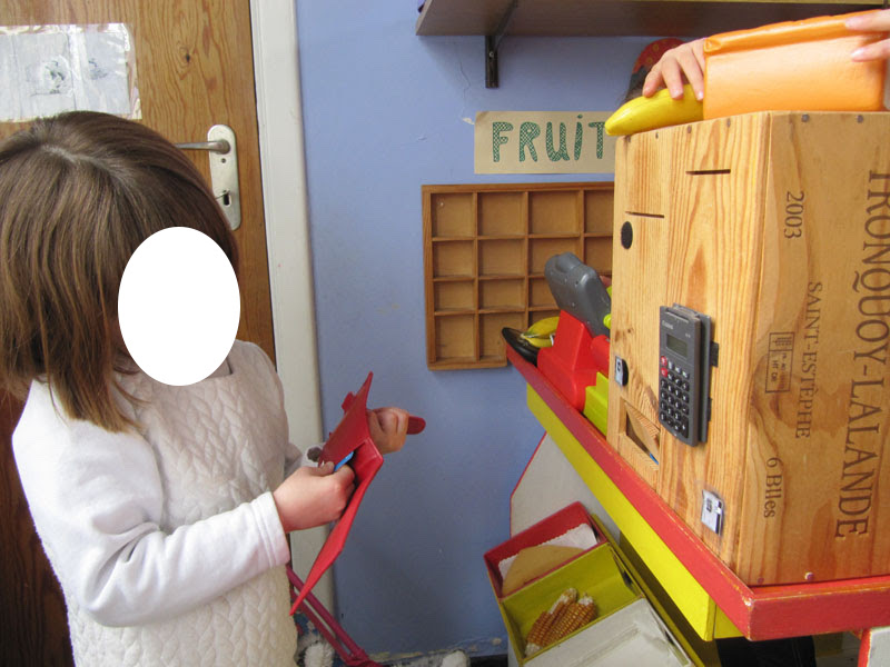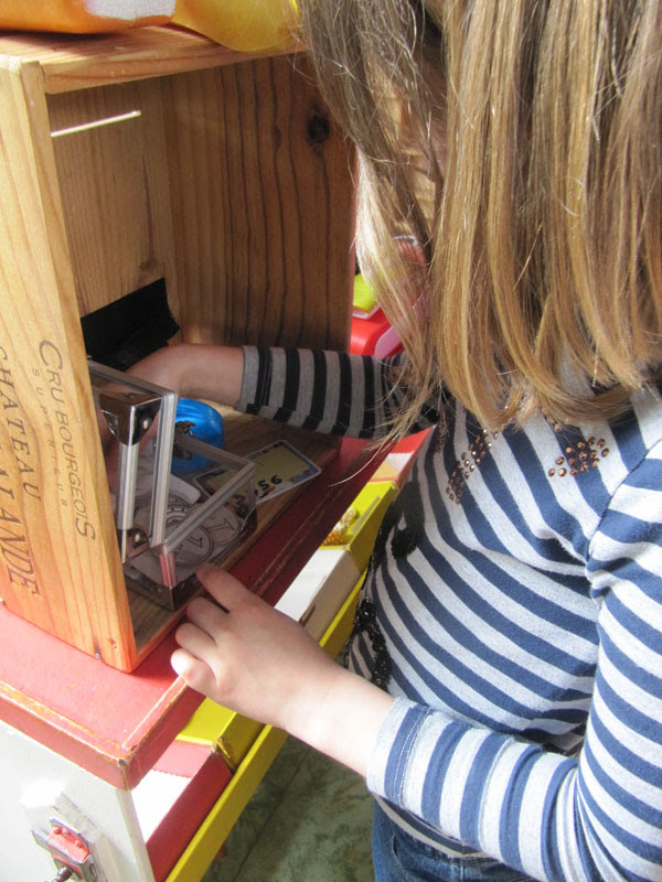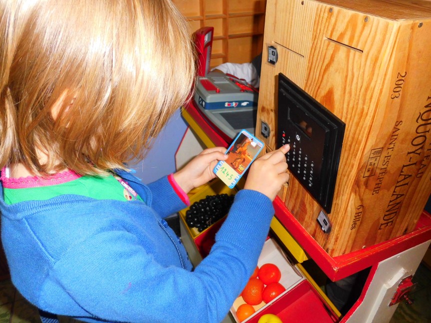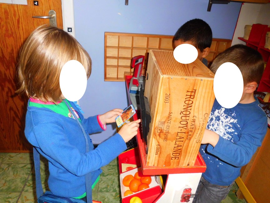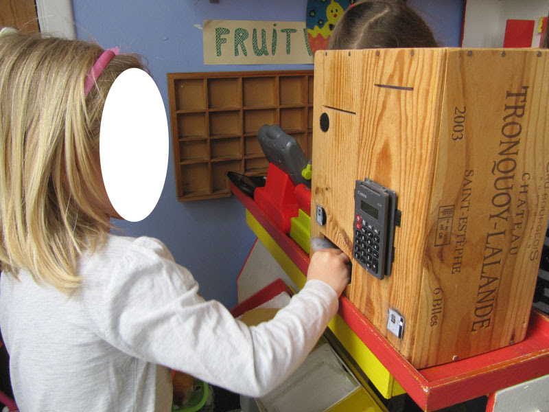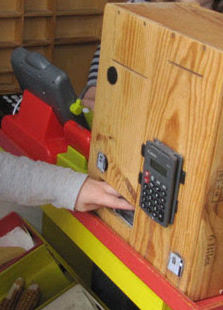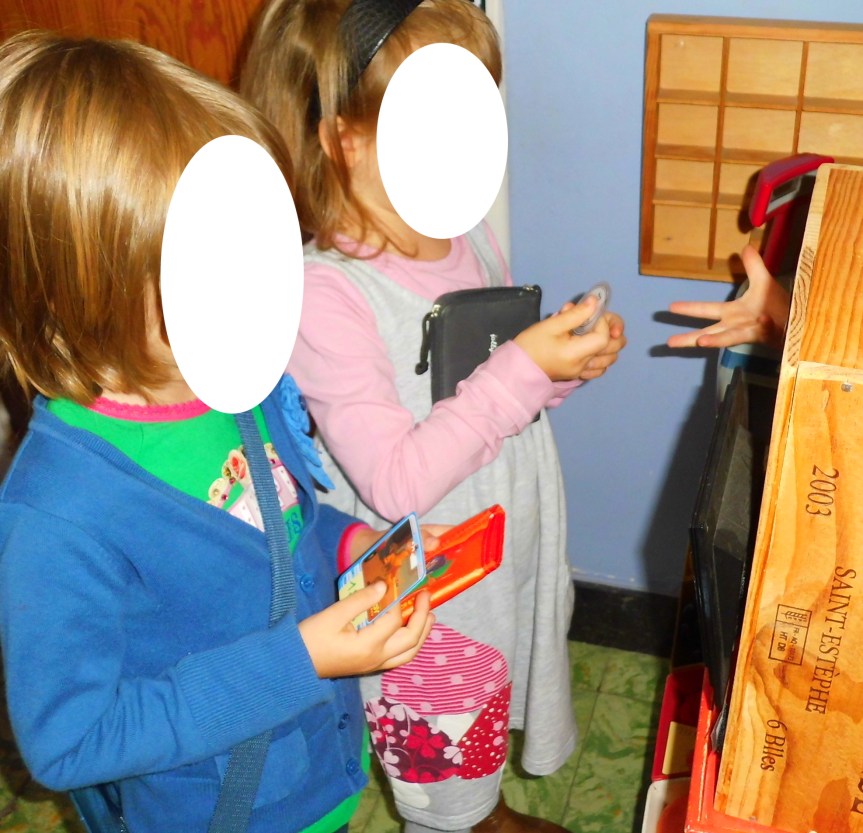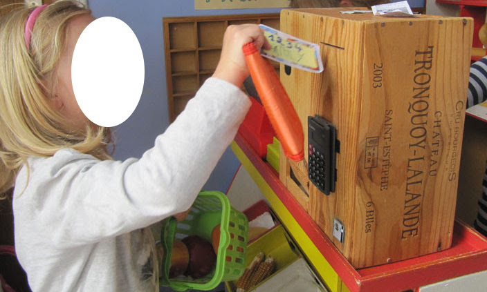 De kinderen zoeken de gewenste koopwaren uit en halen in de winkel aan de bankcontact het gepaste geld af. Ze betalen onmiddellijk zodat het geld de winkel niet verlaat! Een goede oplossing voor het speelgeld dat anders overal terecht zou komen.