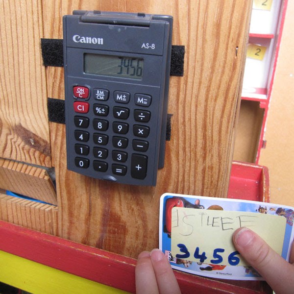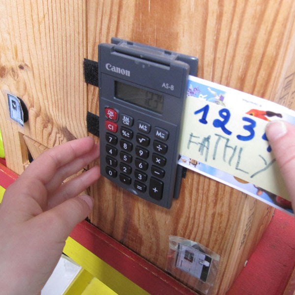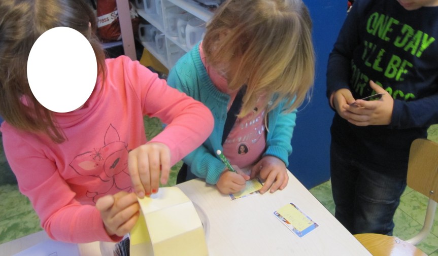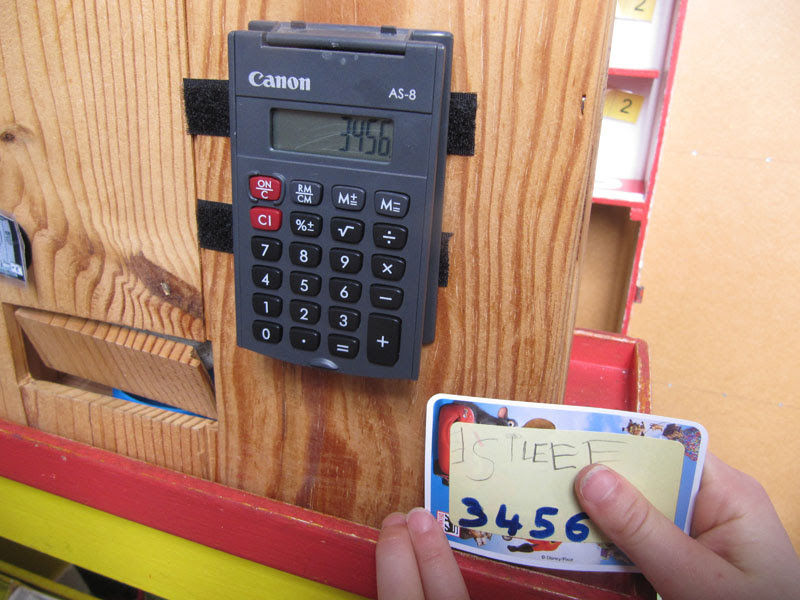 Ze maken eerst een bankkaart (verzamel-kaarten uit warenhuizen met een beschrijfbaar etiketje erop) en bedenken een nummer van vier cijfers.