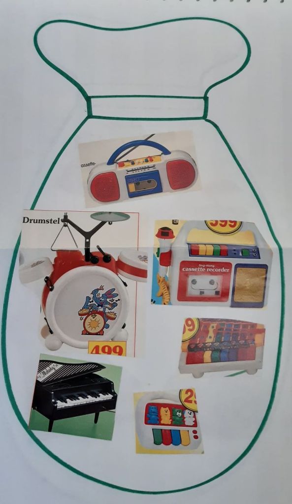 – Voorbereiding: op grote A3-bladen wordt telkens in het midden een uitgeknipt plaatje van een bepaald soort speelgoed (bijv. een pop, een blokje, een auto, een robot, een kleurpotloden-set, …) gekleefd. Dit plaatje komt uit een speelgoedmagazine zoals er veel in de brievenbus vallen tijdens de Sinterklaasperiode.