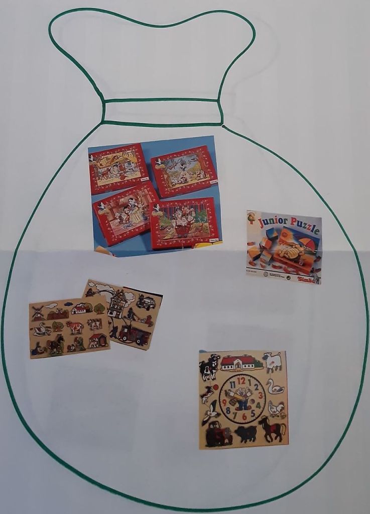 – In de kring tekent de juf op grote papieren telkens 1 zak van Sint en Piet rond het plaatje zodat alle speelgoedjes in een zak zitten. Oudere kleuters kunnen daarbij helpen.