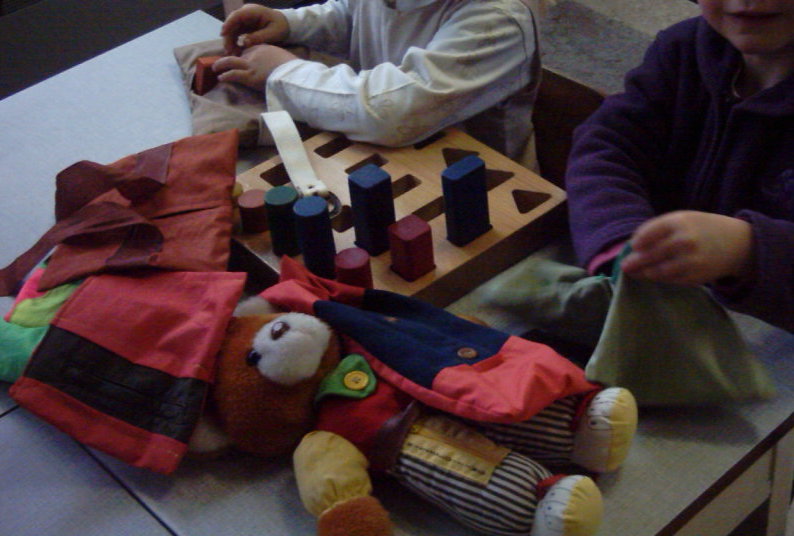 Als je een tijdje oude kledingstukken met specifieke sluitingen bijhoudt dan kan je die verwerken in een aanbod voor het oefenen van de fijne motoriek en de zelfredzaamheid.
