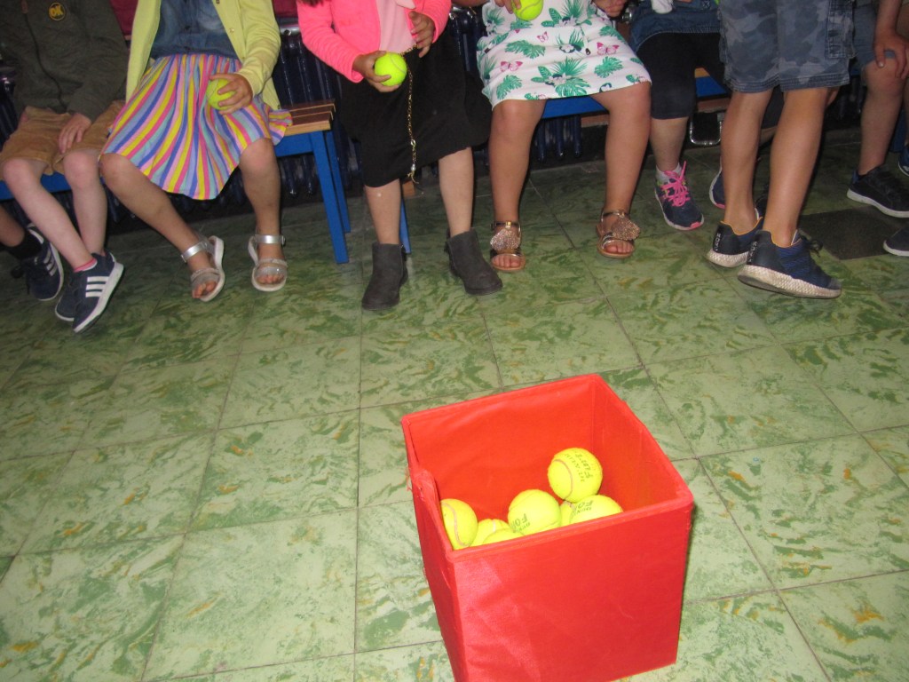 Op het einde van hun reeks mikken de kleuters de tennisbal in de verzamelbak.
