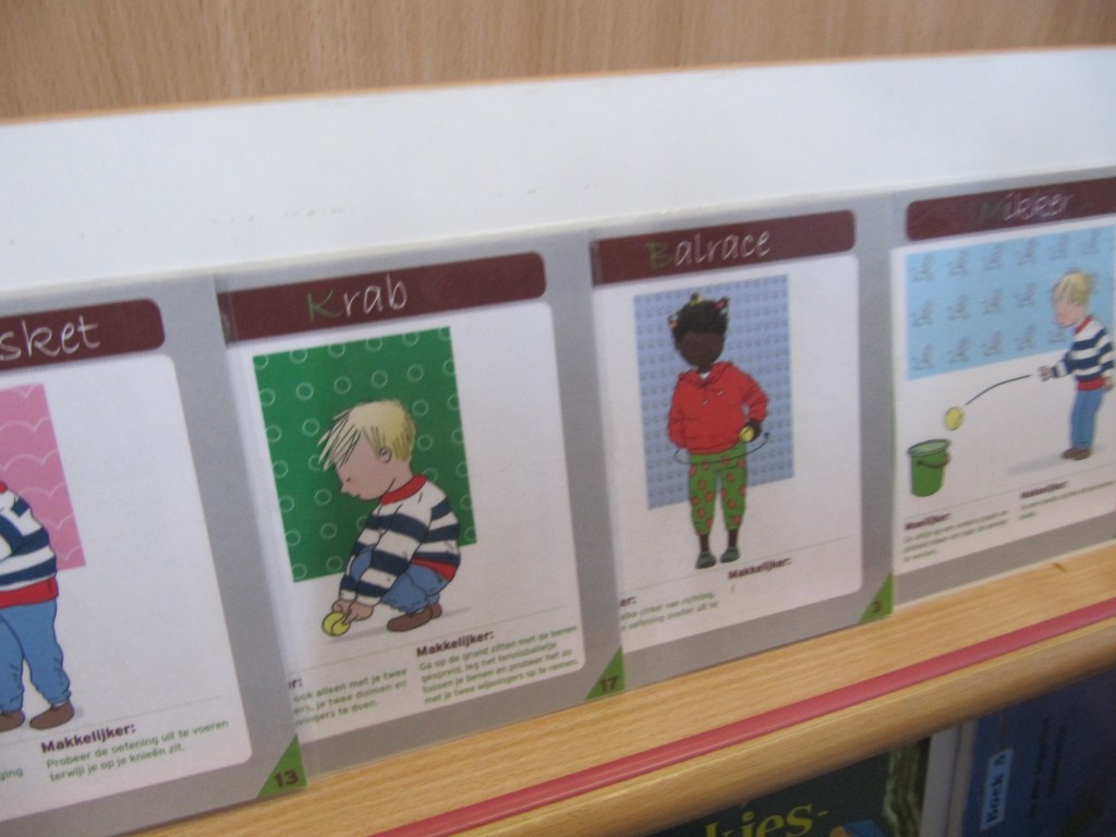 De eerste kleuter in de klas neemt de bak met tennisballen en plaatst die in het midden van de kring. Alle kleuters die aan de deur het kindje van de dag begroetten, mogen nu meteen een reeks oefeningen op eigen tempo uitvoeren. De oefeningen hangen, als in een stappenplan op een goed zichtbare plaats omhoog.