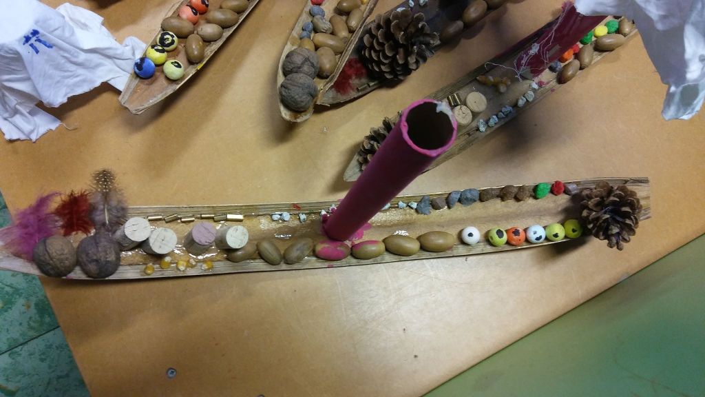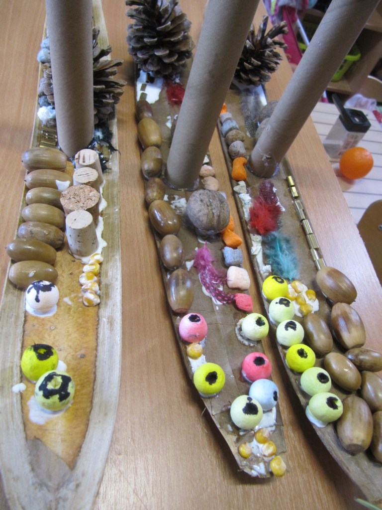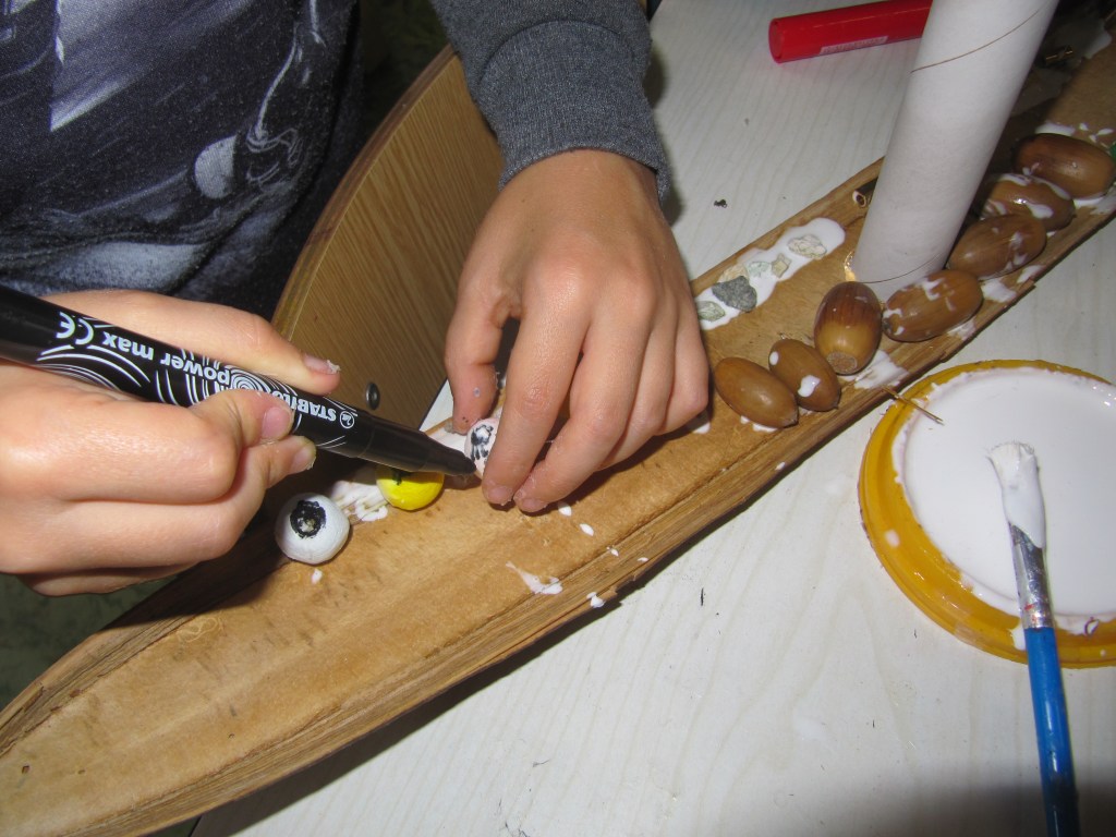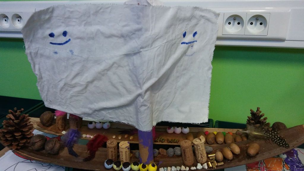 - Het feit dat het een griezelboot werd komt vooral voort uit het thema waar we mee bezig waren, de beschikbare materialen (herfst) en het idee van een kleuter om een enge boot te ontwerpen.
