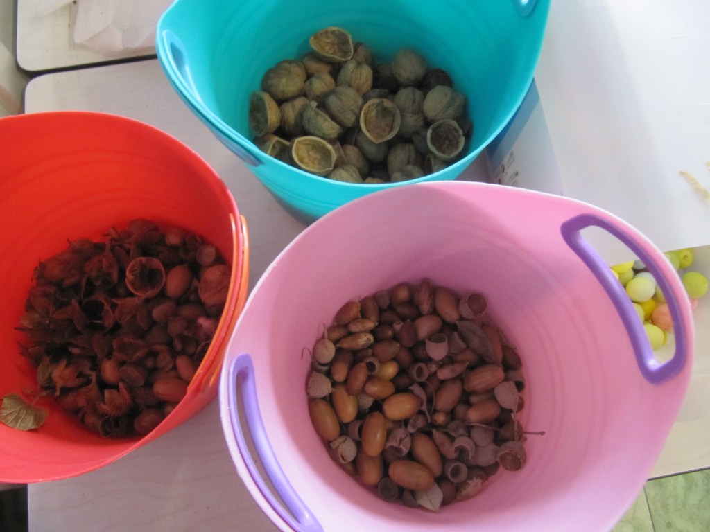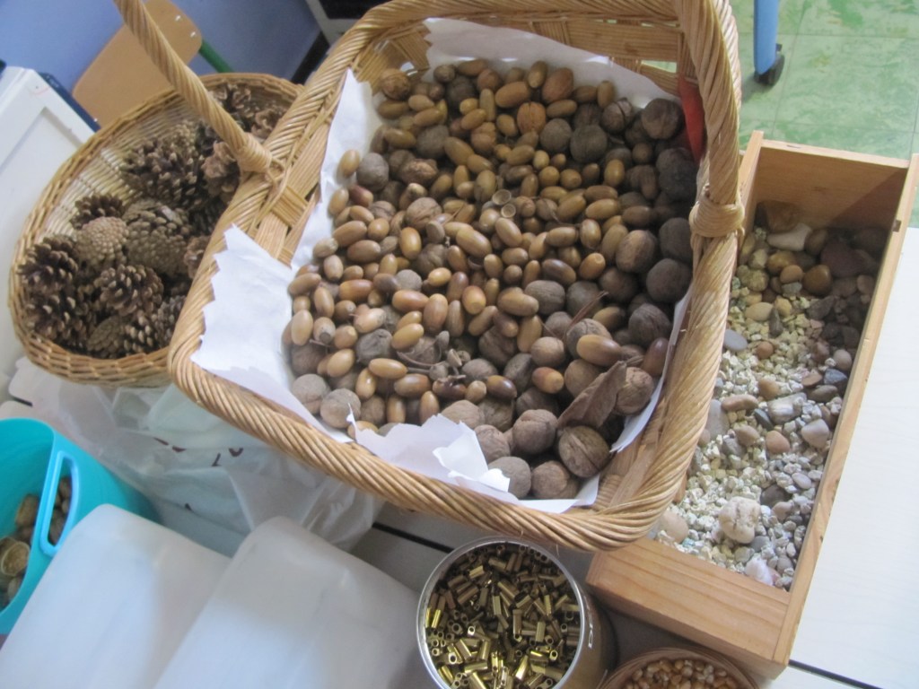 - Ze kleven bijv. 1 dennenappel, 2 eikels, 3 pluimpjes, 4 steentjes, 5 kastanjes, 6 stokjes,…
