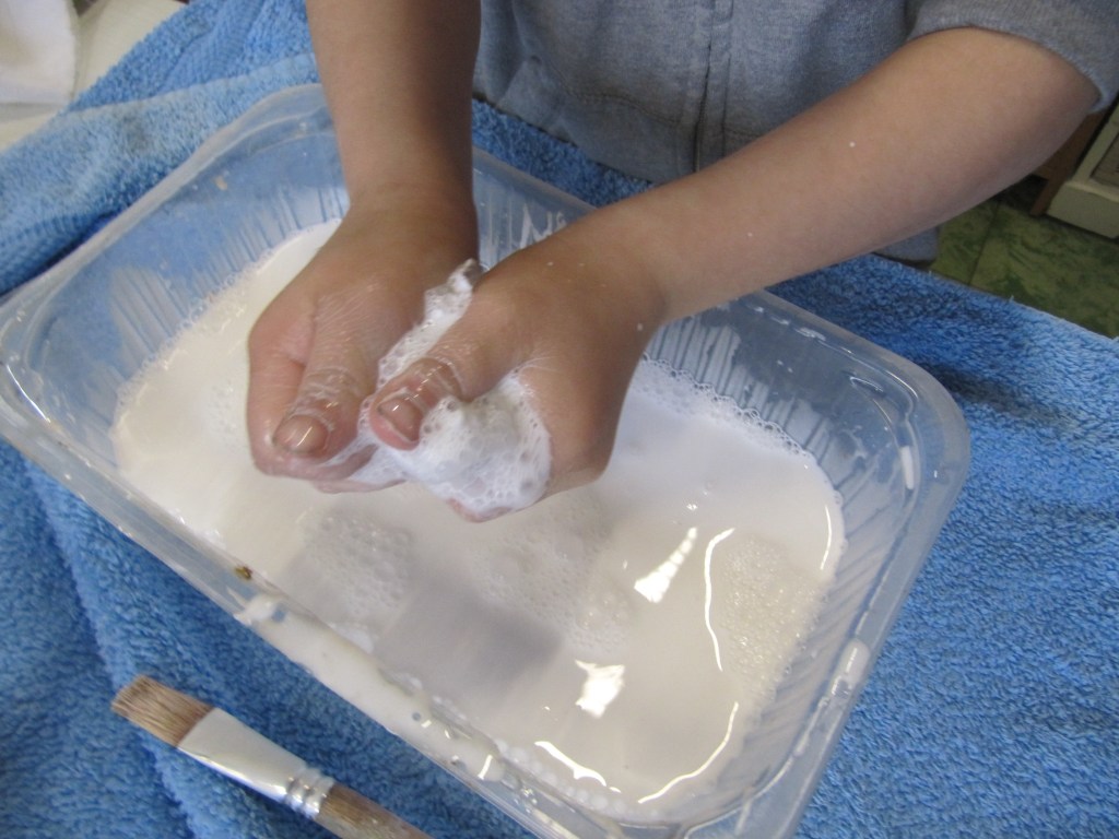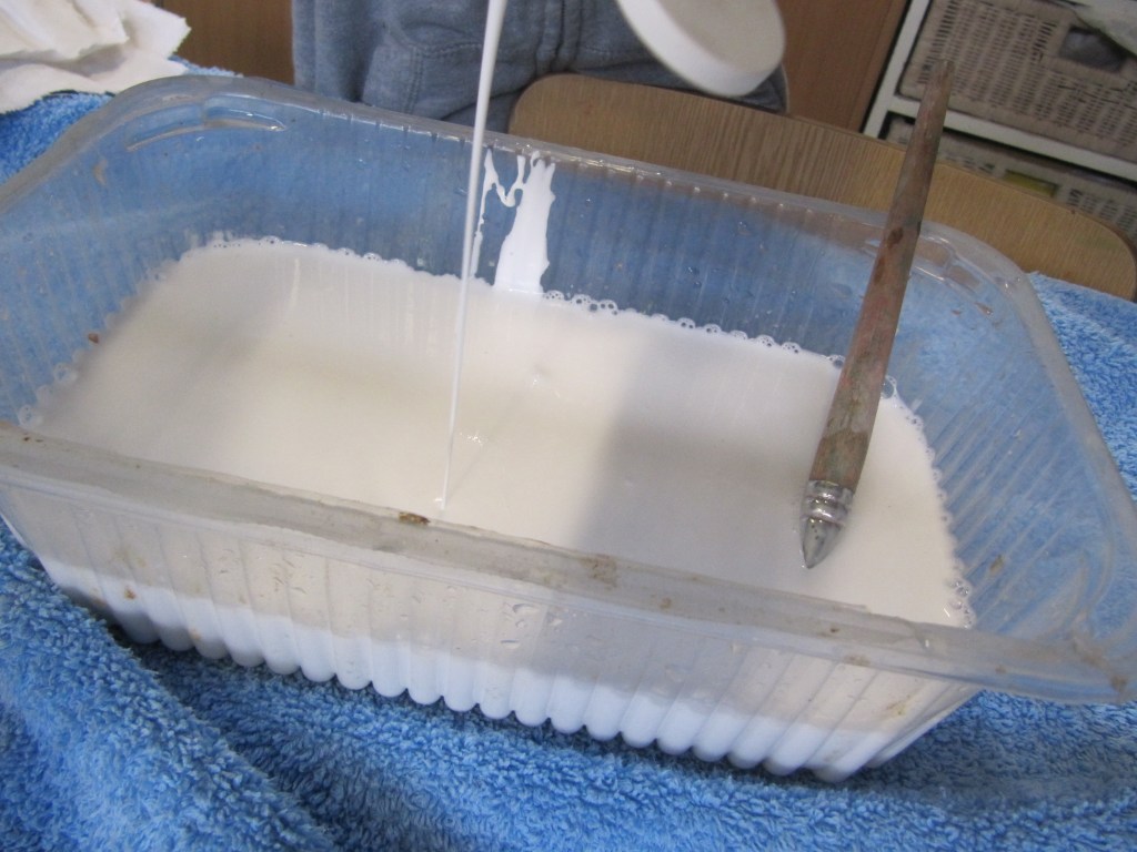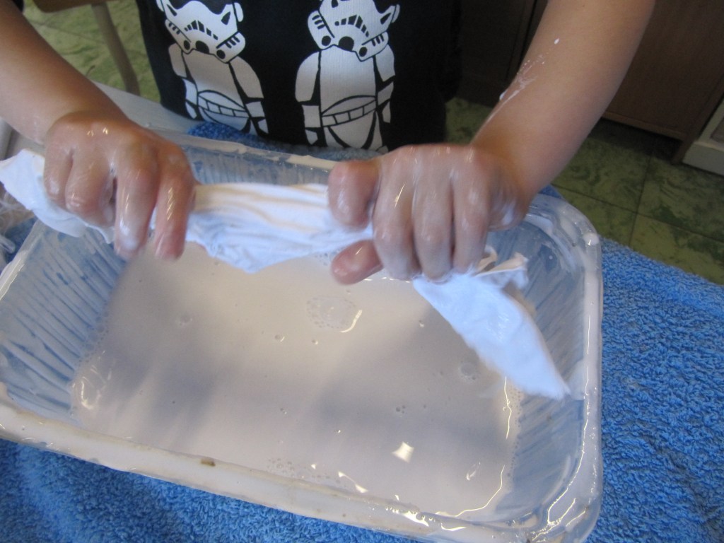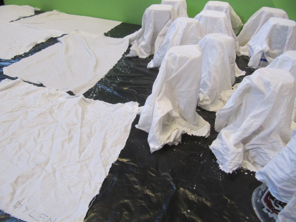 - Later wordt een zeil gemaakt door een stuk laken in de lijm te doppen, uit te wringen en te laten drogen (plat op een plastiek of over een potje zodat het later een spookje kan worden).
