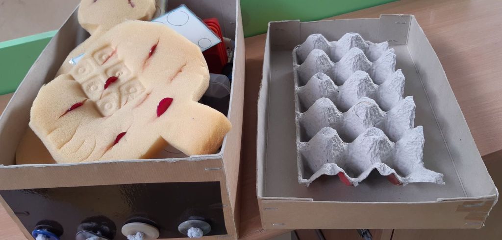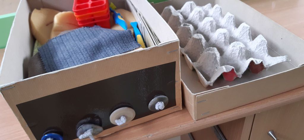 - In het deksel een stukje eierdoos om spontaan sorteren, tellen, … uit te lokken.